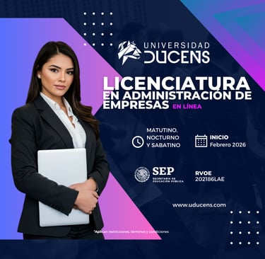 ¡Forma parte de la primer generación de nuestra destacada Licenciatura en Administración de Empresas! Te ofrecemos un paquete completo que incluye tu primera colegiatura al 50% de descuento (Precio regular $5,824.00 MXN), inscripción a Ducens (precio regular de $1,000.00 MXN) e inscripción SEP (precio regular de $250.00 MXN). Es valido hasta el 31 de enero, podrás disfrutar de nuestro precio promocional todo por $2,912.00 MXN. No dejes pasar esta oportunidad única. Las clases comienzan en febrero de 2026. Esta es tu oportunidad para dar el siguiente paso en tu carrera profesional.
